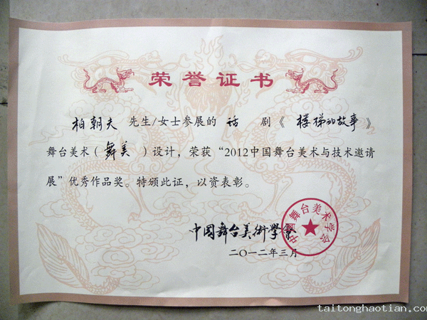 近日传来喜讯,艺术系柏朝夫教授舞美设计作品——话剧《楼梯的故事》荣获“2012中国舞台美术与技术邀请展”优秀作品奖!