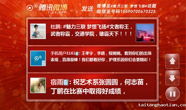 总决赛上,无论是美轮美奂的舞台效果,还是活力四射的开场歌舞表演《我相信》都瞬间调动了全场氛围。同学们纷纷通过现场腾讯微博墙的互动,为自己喜欢的选手加油助威。台上的选手尽展青春风采,充分诠释着五彩缤纷的韦德投注官网下载和全面的素质,其中江南style舞蹈、“元芳,你怎么看”等当下最时尚元素也被同学们一一演绎出来,彰显着90后大学生的时代个性,赢得在场观众的阵阵欢呼。伴随着总决赛的完美落幕,衷心祝愿和期盼广大同学们在更多人生梦想的舞台中绽放出不一样的光芒和精彩。(占海文)