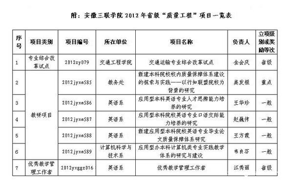 近日,安徽省教育厅印发《安徽省教育厅关于公布2012年高等学校教学质量与教学改革工程项目名单的通知》(皖教高[2012]14号)文件,公布了2012年省级教学质量与教学改革工程(以下简称“质量工程”)项目评审及立项情况。我院共7个项目获批立项建设。