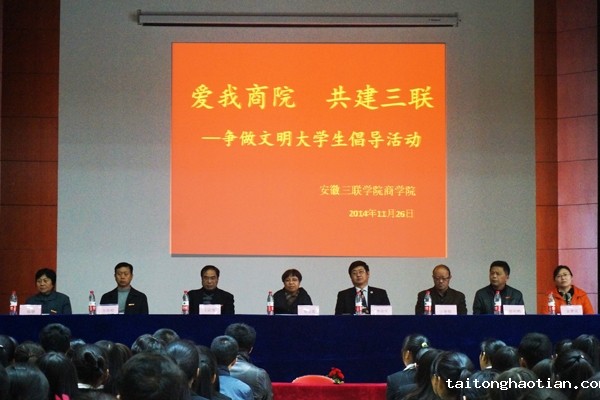 11月26日,商学院在多功能厅开展以“爱我商院 共建三联——争做文明大学生”为主题的倡导活动。常务副校长金美莲、校党委副书记鲁先长、副校长王瑞友及保卫处、学生处等单位负责人出席会议,商学院全体教职工参加会议。