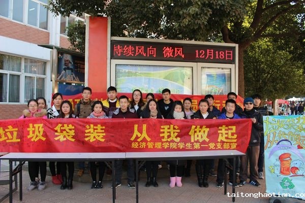 为响应学校号召,营造文明、卫生的生活环境,经济管理学院学生第一党支部于12月18日中午在生活区开展了“垃圾袋装 从我做起”的主题签名活动。