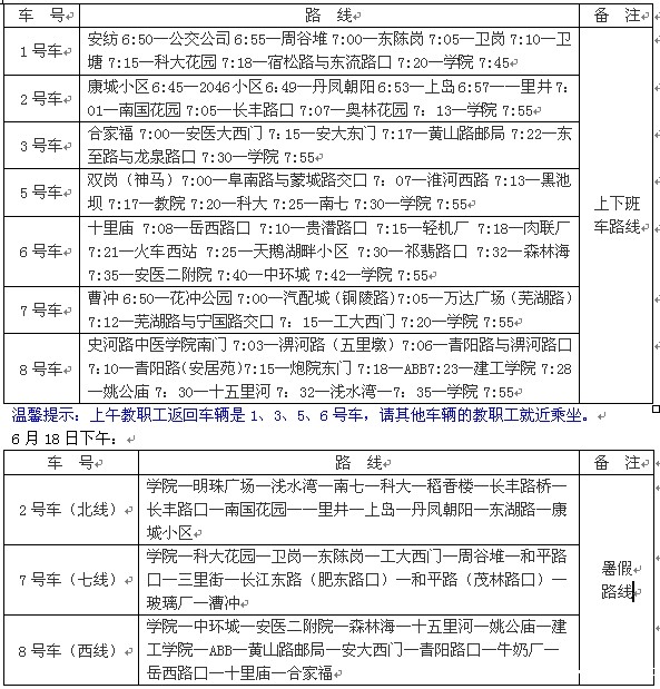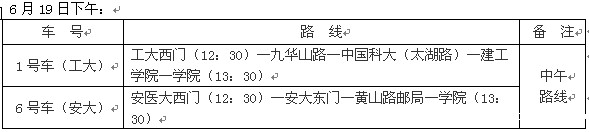 为了确保全国大学英语四六级和英语应用能力考试工作的顺利开展,现将6月18日(星期六)和6月19日(星期日)二天的校车路线安排如下: