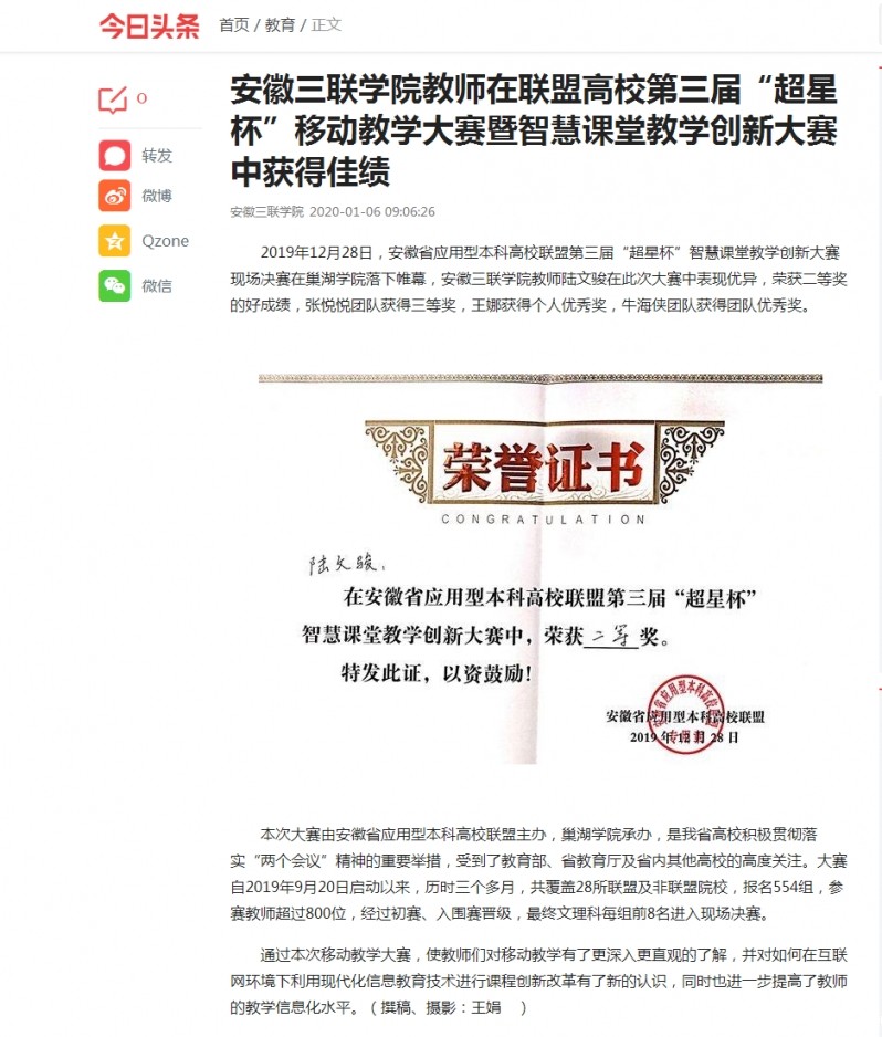 今日头条:韦德官方网址教师在联盟高校第三届“超星杯”移动教学大赛暨智慧课堂教学创新大赛中获得佳绩