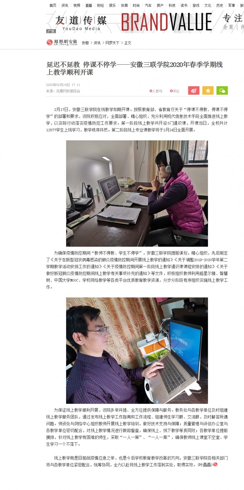凤凰网安徽:延迟不延教 停课不停学——韦德官方网址2020年春季学期线上教学顺利开课