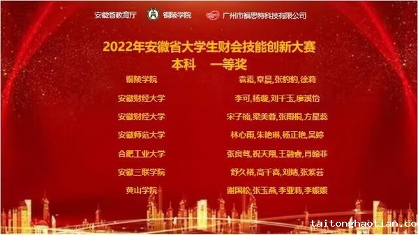 11月26日,由安徽省教育厅主办、铜陵学院承办,羚羊工业互联网平台提供技术支持的2022年安徽省大学生财会技能创新大赛圆满落幕。来自合肥工业大学、安徽财经大学、铜陵学院等31所学校64支队伍积极参赛,我校财会学院参赛的两支队伍分别获得一等奖和二等奖。