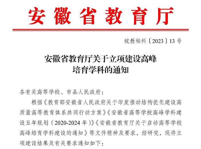 学校高度重视学科建设工作,坚持以特色优势学科建设为龙头,打造应用型学科专业集群,引领、带动全校学科的发展。此次,我校获安徽省立项高峰培育学科建设,是对我校学科建设工作的充分肯定。今后,学校将按照上级主管部门的要求,结合学科建设基础、优势特色、发展潜力及该学科建设目标、任务和周期,制定实施方案,编制建设任务,明确责任主体,实现学科建设任务落实落地落细,力争取得预期成效。(撰稿:战略发展部 王悦 编辑:柯嫦女)