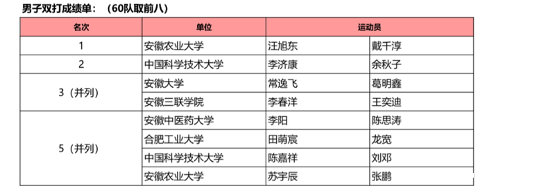 我校羽毛球队男双组沉着应对,不惧挑战,一路披荆斩棘,以顽强拼搏的精神和毅力战胜来自合肥工业大学、安徽师范大学、安徽农业大学等的羽毛球传统强校选手,顺利晋级,取得男子双打第三的优异成绩。
