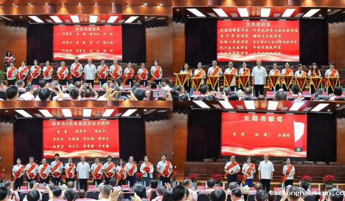 大会对年度荣誉及奖项获得者进行了现场表彰和颁奖,包括第八届辅导员素质能力大赛获奖教师、第十九届青年教师教学基本功大赛获奖教师、2023年度优秀辅导员、2023年度优秀教师。此外,还对2022-2023学年优秀教研室、省级荣誉获得者、国家级A类赛事获奖指导教师进行了表彰。获奖教师共计117人次,金会庆、王光虎分别为他们颁发荣誉证书。