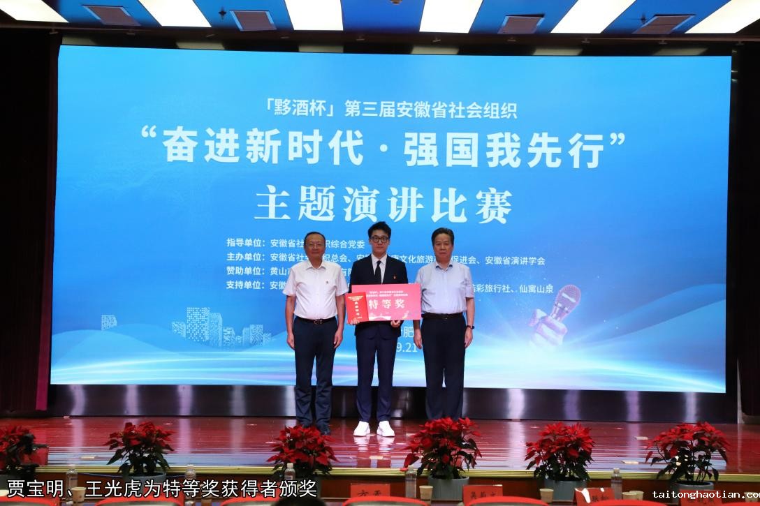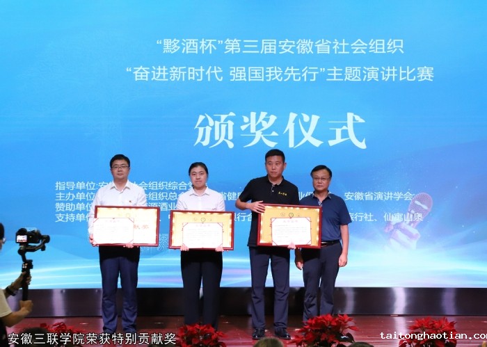 9月21日,由安徽省社会组织综合党委指导,安徽省社会组织总会、安徽省健康文化旅游产业促进会、安徽省演讲学会主办的“黟酒杯”第三届安徽省社会组织“奋进新时代 强国我先行”主题演讲比赛决赛在我校学术报告厅顺利举办。