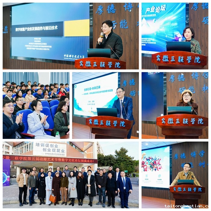 在下午举办的数字文化创意论坛上,行业及企业代表汇聚一堂,副校长蔡文芬为本次论坛致辞,中科大新媒体研究院周荣庭院长以“探讨数字创意产业的最新发展趋势和前沿技术”为主题进行演讲,潘涛以“创新引领·未来已来——院部改革、微专业建设与校企合作的探索与实践”为主题进行演讲,合肥乐堂动漫信息技术有限公司COO耿明、合肥金诺数码科技股份有限公司董事长田地,安徽省数字文化产业创新研究院副部长、三七互娱网络科技集团股份有限公司公共事务经理张震,合肥磐石智能科技股份有限公司副总经理李岩,合肥硅基智能科技有限公司总经理舒建旺,合肥首镜科技有限公司合伙人李德虎,数字创意现代产业学院房景丽副教授,数字媒体艺术专业负责人张策讲师先后上台做了精彩的报告。