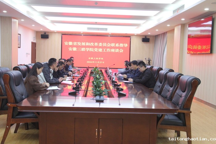 11月27日下午,安徽省发展和改革委员会社会处处长、一级调研员曹皖湘,机关党委副书记、纪委副书记张建勋等一行来校联系指导并召开党的建设工作座谈会。省教育督导专员、校党委书记王光虎主持会议。常务副校长江秀丽,党委副书记、副校长赵翀,副校长操晓峰、蔡文芬、宋梦岚,及相关职能部门主要负责同志参加会议。