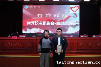 洪梅为李鹏颁发就业创业校外导师证书。许玉梅作为李鹏的辅导员为其颁发优秀校友荣誉证书。团委书记吴琦围绕大学生志愿服务西部计划的政策背景、注意事项及常见问题作全面解读,并分享我校西部计划志愿者优秀事迹。