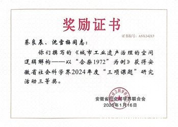 近日,省社会科学界联合会发布《关于2024年度“三项课题”研究活动优秀成果和先进单位的通报》。安徽竹稞学宫文化研究中心2项成果获奖,余晖《加快长三角(宣城)产业合作区高质量发展研究》获二等奖,蔡良辰、沈雪梅《城市工业遗产治理的空间逻辑解构——以“合柴1972”为例》获三等奖。安徽竹稞学宫文化研究中心获2024年度“三项课题”研究活动先进单位。