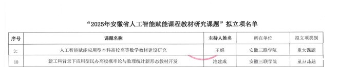 近日,安徽省高等教育研究所公布“2025 年安徽省人工智能赋能课程教材研究课题” 立项名单,全省共有 35 项课题获批立项,其中3 项重大课题和 14 项重点课题。在此次评选中,我校工学部教师王娟主持的 “人工智能赋能应用型本科高校高等数学教材建设研究” 成功立项为重大课题,池建成负责的 “新工科背景下应用型民办高校概率论与数理统计新形态教材开发” 获批重点课题。